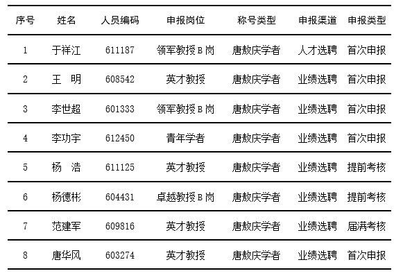 “匡亚明/唐敖庆学者”人才岗位聘任实施细则(修订)》(校发〔2023〕82号),经个人申报,学院组织对申报材料进行真实性审核,于2026年3月5日-11日分别召开教学委员会、学术委员会、党委会和党政联席会,对申报人的政治表现、师德师风、教育教学、人才培养、科学研究和违规违纪违法等情况做综合鉴定,通过于祥江等8人申报“唐敖庆学者”人才岗位,现将申报人材料在113-1办公室进行公示,公示期为5个工作日(2026年3月13日-19日)。