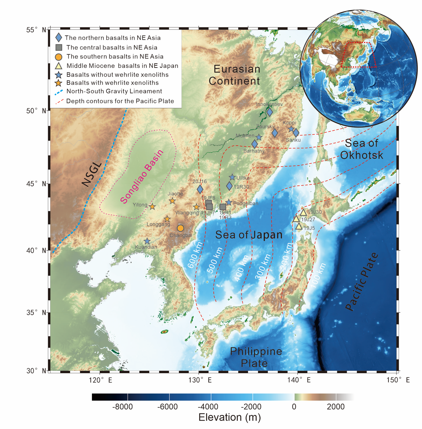地球深部动力学创新团队”联合中国地质大学(北京)刘盛遨教授,对东北亚陆缘、平行于俯冲带分布的中新世板内玄武岩开展了系统的Mg-Zn同位素研究(图1),结合东北亚陆缘新生代玄武岩中地幔捕虏体的空间分布和地球物理观测资料,为单一俯冲带小尺度碳输入的三维空间变异提供了关键证据。具体研究成果如下: