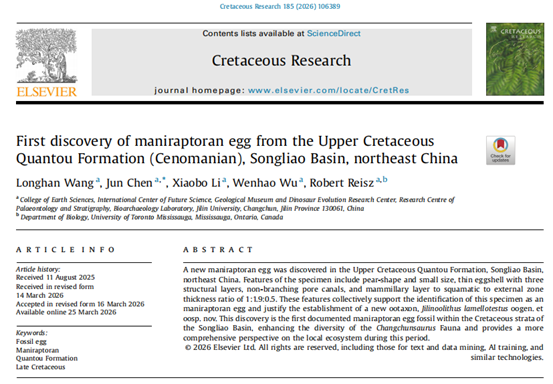 以上研究成果于2026年4月3日正式以“First discovery of maniraptoran egg from the Upper Cretaceous Quantou Formation (Cenomanian), Songliao Basin, northeast China”为题发表在国际知名学术刊物《Cretaceous Research》上。海角社区