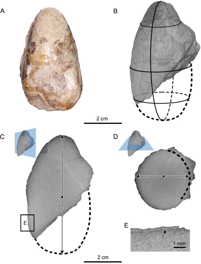 注:A 为化石实物照片,B 为侧向CT重建及轮廓图,C、D 分别为纵向和横向CT切片,E 为蛋壳细节(黑色箭头指示蛋壳位置)