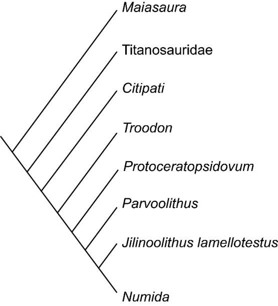 从化石特征与系统发育分析来看,薄外壳吉林蛋可被归为手盗龙类蛋化石,同时具备显著的早期鸟类蛋特征。其鳞状层发育典型的鳞状超微结构,结合光滑无饰的蛋壳表面、三层壳结构及无分支的孔隙特征,均契合手盗龙类蛋化石的核心鉴别依据;而其小巧的体型、超薄的蛋壳结构,与已知早期鸟类蛋特征高度吻合,系统发育分析也显示其演化位置与鸟类蛋亲缘关系极近。结合非鸟类兽脚类恐龙与鸟类的密切亲缘关系,该蛋化石存在归为鸟类蛋的可能性,但因化石内部未发现胚胎遗存,暂无法将其进一步确定归入鸟类蛋范畴。