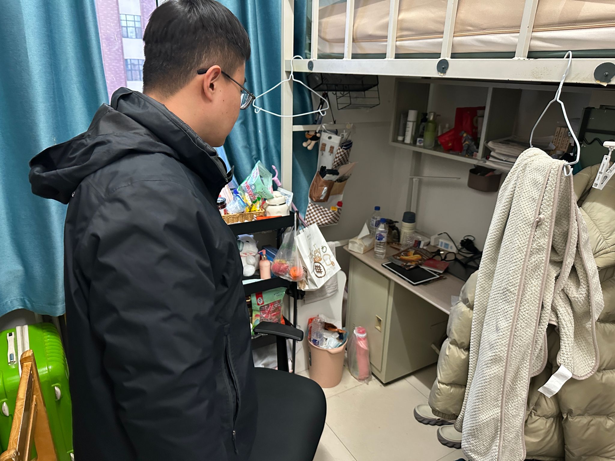 检查过程中,老师们本着对学生安全高度负责的态度,逐层逐间进行排查。每走进一间寝室,辅导员首先查看床铺、书桌、储物柜等区域,仔细检查是否有电热毯、电煮锅、电卷棒等违章电器;随后认真查看寝室内使用的插排是否合规、电线是否破损、是否存在串联使用现象;最后提醒学生注意人走电断,切勿将手机、充电宝等长时间充电。